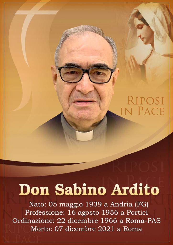 Nella serata di martedì 7 dicembre scorso, il caro Don Sabito Ardito, che per cinquant’anni ha svolto servizio nella nostra Parrocchia accompagnando le persone della nostra comunità, è tornato alla casa del Padre. Le esequie saranno celebrate domani, sabato 11 dicembre 2021, alle ore 11:00 presso la Basilica del Sacro Cuore di Roma, sita in Via Marsala. Accompagniamolo e affidiamolo al Signore con la nostra preghiera ringraziandolo per tutto il bene profuso.