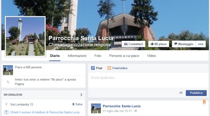 La nostra parrocchia ha una pagina facebook, se utilizzi questo social network cerca Parrocchia Santa Lucia e cerca la pagina corrispondente, clicca quindi su “Mi Piace” per avere le informazioni aggiornate sempre a portata di mano.
