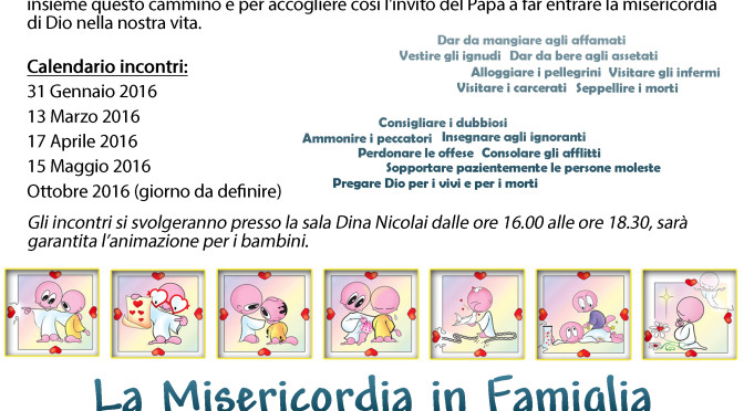 In occasione del Giubileo Straordinario della Misericordia, indetto da Papa Francesco, siamo chiamati a soffermarci come comunità a riflettere sulle opere di misericordia per far diventare questi atteggiamenti sempre più parte della nostra vita. Tutta la comunità parrocchiale è chiamata a partecipare a questi incontri per camminare insieme su questo percorso e per accogliere così…